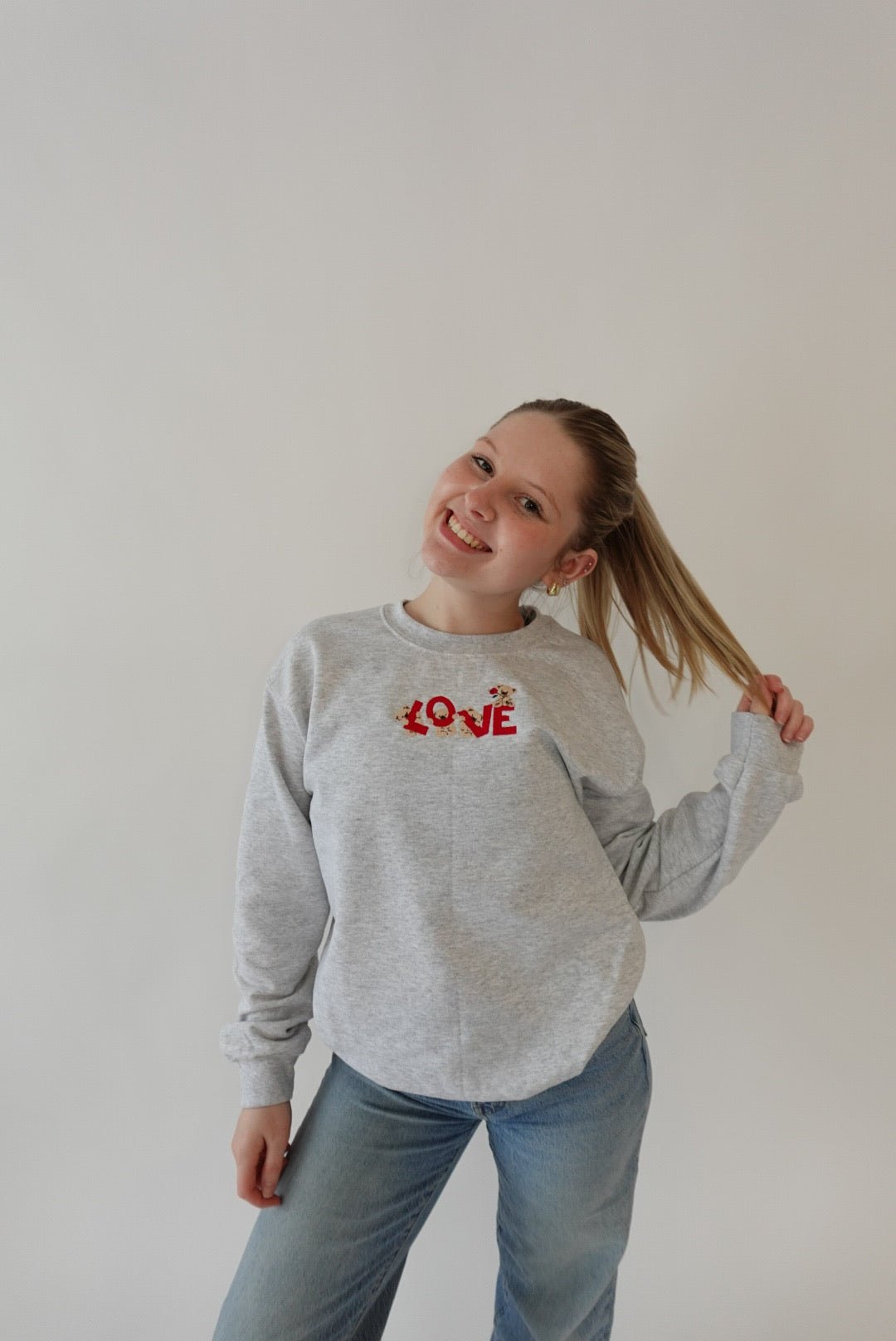 Our “LOVE” sweatshirt is a classic with a sweet, understated twist. Featuring simple embroidered lettering with delicate Valentine-inspired details, this design keeps things minimal while still feeling special.