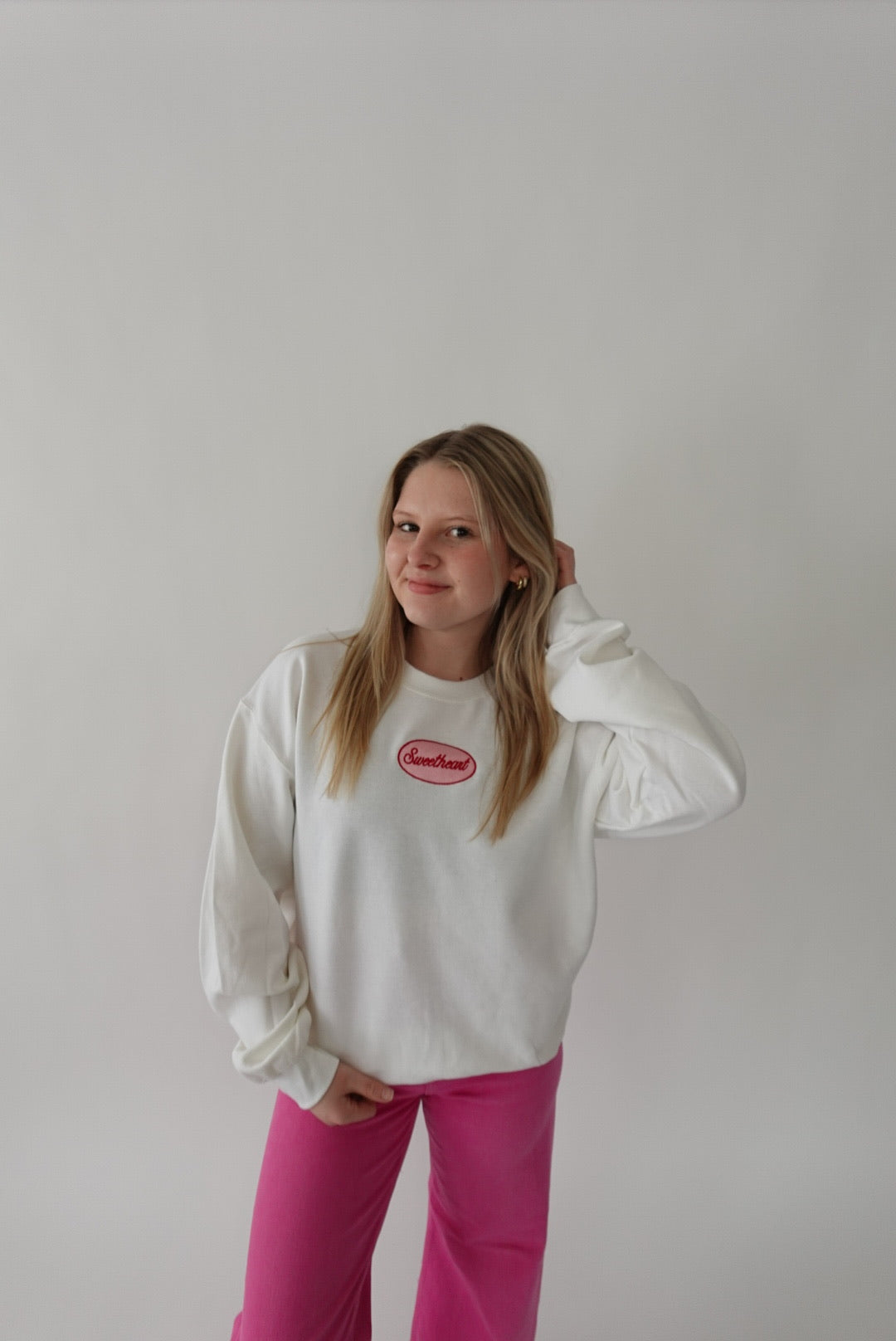 Our “Sweetheart” sweatshirt is a timeless Valentine’s Day staple with a subtle, feminine feel. Featuring a delicate embroidered design in a classic oval frame, this piece adds just the right touch of charm without being over the top.